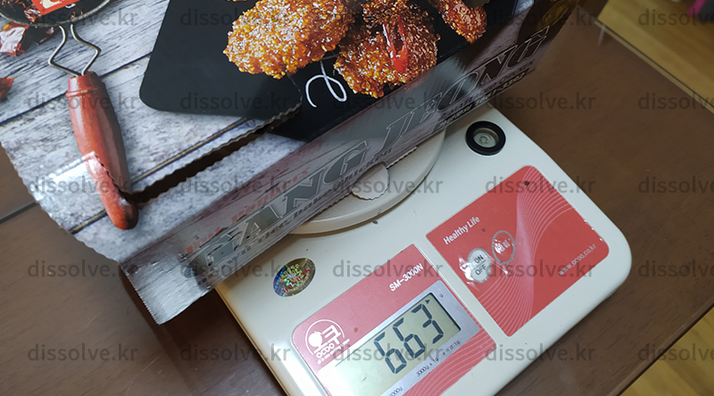 먹은 후의 무게는 ? 박스포함 229g.  그럼 내가 먹은 살은? 663-229 = 434g 튀김 옷이 없어서인가? 튀김닭에 비해서는 적은 무게다.